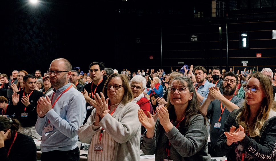 Une prise de parole combative, qui marque l’ouverture des débats sur le troisième thème du document d'orientation du 53e Congrès, intitulé « Pour une élévation et un élargissement du rapport de force », et qui fait écho à la volonté exprimée par d’autres camarades d’une CGT toujours plus offensive. « La banque où je travaille, BNP Paribas, a réalisé un bénéfice de plus de dix milliards d’euros, confie Nassim, de l’union départementale du 13. Elle annonce supprimer 721 postes, dans une banque ou 35 % des salariés sont précaires. Camarades, il y a de l’argent pour créer de l’emploi et alimenter les caisses de la protection sociale. Il ne faut pas rester muer mais agir ! » Les prises de parole se succèdent. D’autres camarades, venus de toute la France, partagent leur même envie d’une organisation plus revendicative, qui assume un rapport de force frontal avec les tenants du capital. « Nous, nous sommes partout et sommes invisibles, détaille Florence, agente des services de propreté des Ports et Docks. Pourtant, nous avons démontré notre utilité publique pendant la crise du Covid, comme nos camarades du ferroviaire ou de l’aéroportuaire. Nos entreprises de propreté se livrent des batailles féroces pour remporter des marchés, quelles que soient les conséquences sur notre travail. Nous, nous tenons notre rôle et la CGT est la première organisation de la branche. » Bernadette, retraitée, de la Fédération Textile, habillement, cuir et blanchisserie témoigne aussi à la tribune. « J'ai travaillé depuis l'âge de 18 ans dans le textile et l'habillement, puis le cuir avant la retraite. Avec le choix de la fermeture de l’usine, avec la CGT, nous avons fait grève pour sauver nos emplois. Cela a déjoué les pronostics de ceux qui voulaient transformer nos usines en musées. L’usine a été reprise par un sous-traitant de Vuitton et 180 emplois ont été créés. » Elle enchaîne : « Ici, des fermetures continuent et la vitrine médiatique des relocalisations occulte la réalité. Il faut des critères pour les aides publiques à la relocalisation. Nos territoires sont sinistrés socialement. La bataille pour l’évolution de nos productions, comme contre la sous-traitance et les salaires ne pourra pas se faire de l’extérieur de nos entreprises. Elles ne se feront pas sans les salariés, la CGT a un rôle central. »